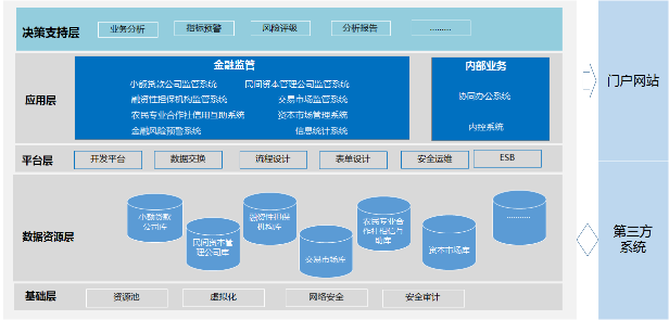 参考国家电子政务技术总体框架的层次结构,金融综合信息平台采取分层架构设计模式,从下至上的分层分别是:基础层、数据资源层、平台层、应用层和决策支持层五部分。同时考虑与门户网站与相关第三方系统的数据交换。