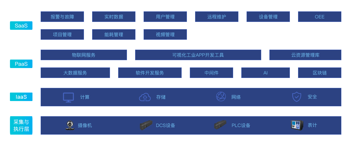 采集执行层完成现场数据的采集及设备执行,现场数据来源主要包括:顺利获得驱动采集现场PLC、仪表、摄像机等数据 IaaS层可完成计算、存储、网络、安全功能 基于Ebpay(中国)云的通用PaaS层给予物联网、大数据、开发平台、AI、区块链等功能 业务应用层包含了设备管理、实时数据、远程维护、能耗管理、视频管理等相关功能,共同构建完善的设备管理体系,完善设备管理工作。为设备运营维护单位给予了高效的集中式、透明化、全方位的精准运营新模式
