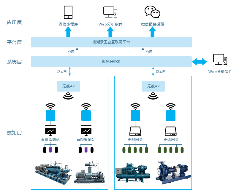 在现场设备表面安装振动、温度传感器,传感器采集设备运行过程中的振动、温度数据,并且将数据传输至现场安装的无线网关和有线监测站无线网关和有线监测站将数据发送至现场服务器,服务器顺利获得工厂外网将数据直接发送至云平台,用户顺利获得微信和Web浏览器的形式查看现场数据,以实现对现场设备进行24小时远程监控和诊断分析