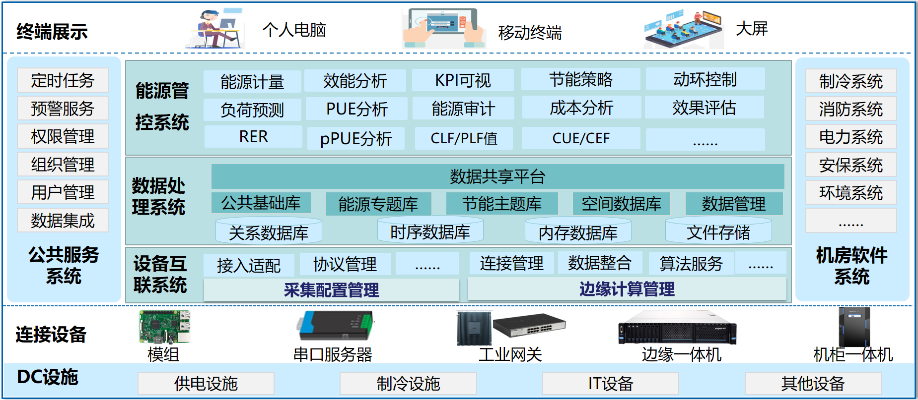 基于统一的数据中心基础设施,建设连接设备、公共服务系统、机房软件系统、设备互联系统、数据处理系统、能源管控系统,面向数据中心给予能源管理和节能服务。依托采集能耗数据、分析能耗趋势、调整控制策略,从而实现能耗的可规划、可计量、可控制、可评估。为绿色数据中心规划、建设、指标优化、评测给予全栈支撑。