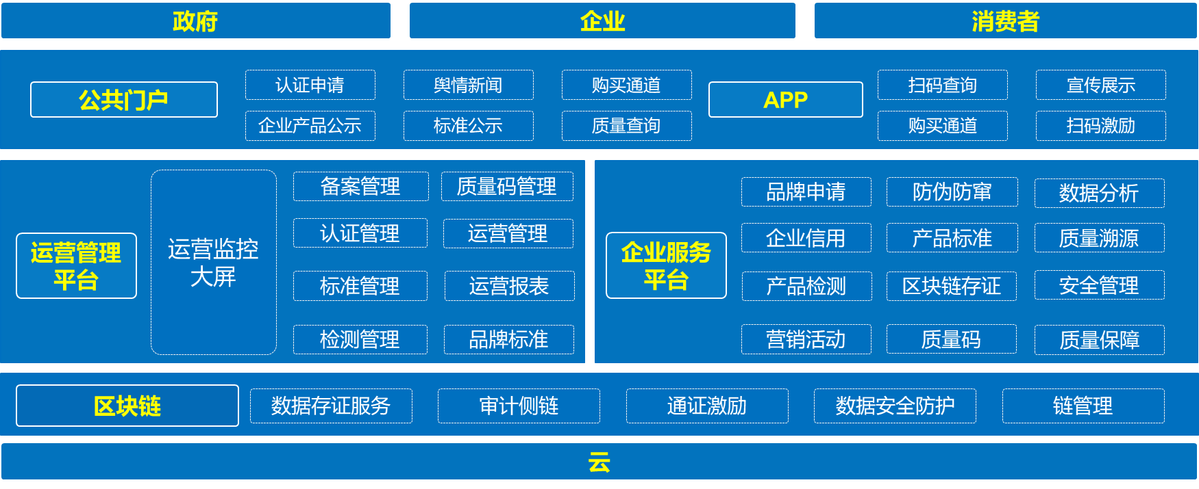 区域品牌公共服务平台打造“122N”体系,即“一链两平台两端N服务”。一链为区块链平台,基于区块链技术进行存储,利用区块链技术确保数据安全、不可篡改;两平台为运营管理平台和企业服务平台,顺利获得品牌数字化认证与全生命周期质量管理,支撑区域品牌企业数字化认证和品牌产品动态运营管理。两端为web端与移动端两类对外宣传门户。平台面向消费者、企业、政府给予的质量查询、窜货管理、数字化营销、动态化监管等N项数字化服务。