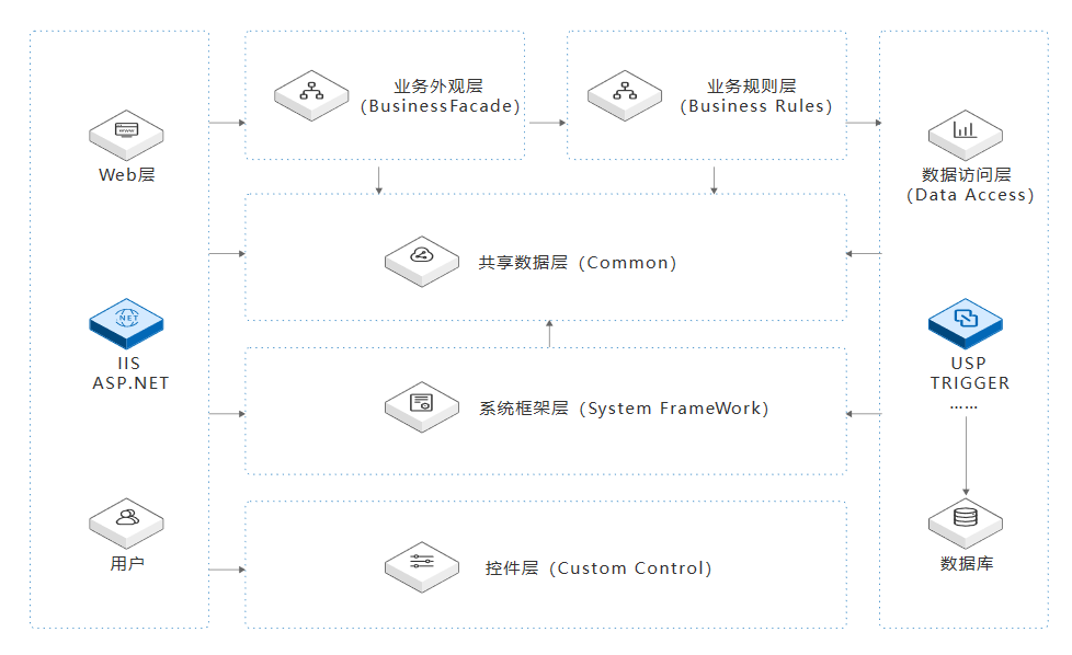 环境智能监管系统采用B/S(Browser/Server)架构,其关系如上图所示。根据.NET环境下Web应用开发的特点,并结合用户需求,将一个Web应用划分为Web层、业务外观层、业务规则层、数据访问层、Common层、System Frame Work层和自定义控件层。其中,Web层定义用户界面和操作界面逻辑控制;业务外观层(Business Facade)将用户界面和各种业务规则隔离开,为Web层给予调用接口;业务规则层(Business Rules)定义业务逻辑和规则;数据访问层(Data Access)定义各种数据访问逻辑,控制数据的访问模式;Common层为Web层、业务层和数据访问层给予公共性服务;System Frame Work层定义系统信息,为Web层和数据访问层给予服务;自定义控件层(Custom Control)为Web应用所用到的自定义控件。用户顺利获得Web浏览器与Web层交互,Web层调用业务外观层,业务外观层调用业务逻辑层的服务,业务逻辑层又调用数据访问层的服务,最后,数据访问层调用数据层的服务