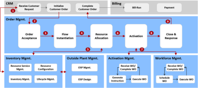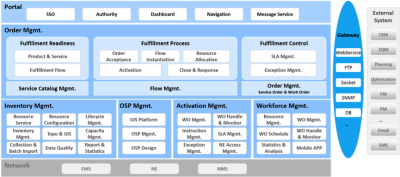 Order Management (OM) is the core system of service fulfillment solution. It integrates with CRM to receive customer order and start service fulfillment process. It schedules the process by flow and interacts with IM, AM, WFM and other systems to perform fulfillment actions.