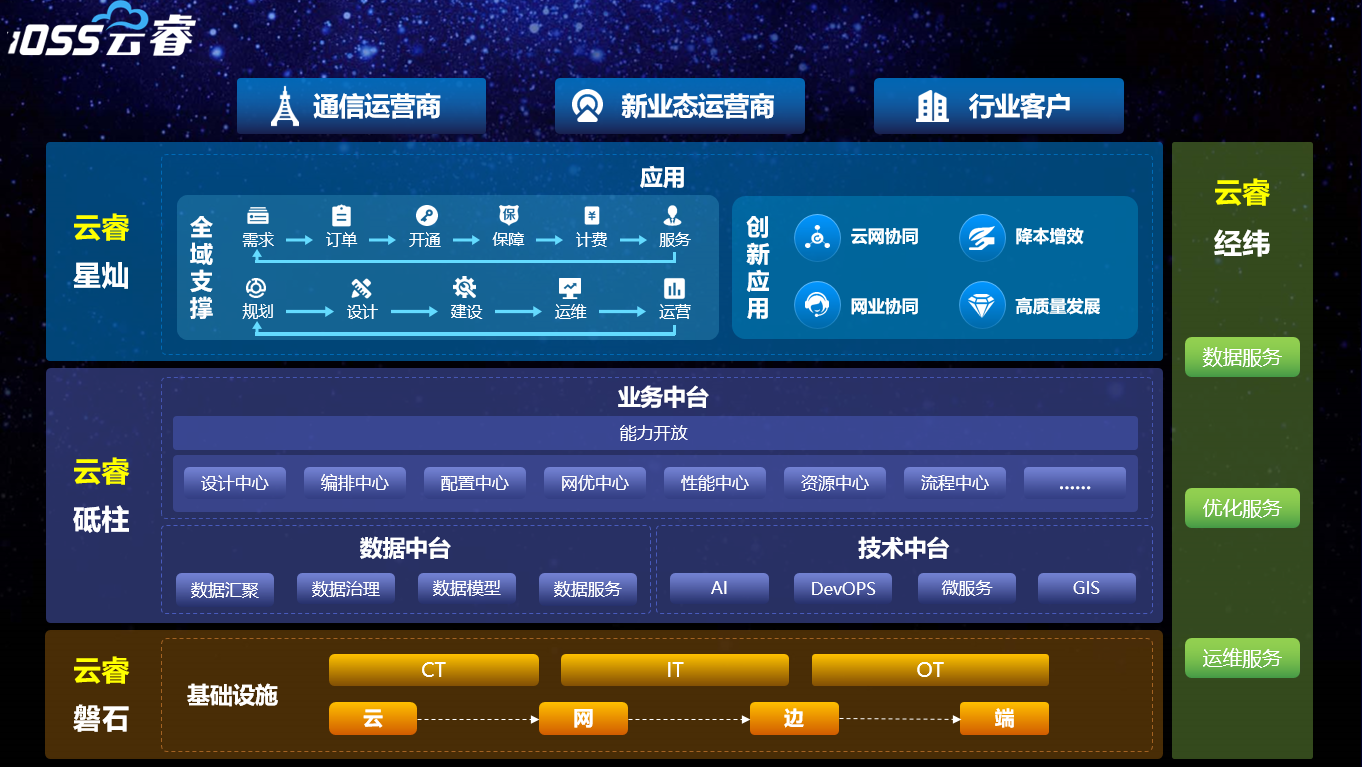 Ebpay(中国)iOSS云睿包括4大方向,涵盖通信运营商所需要的核心场景和能力:云睿磐石、云睿砥柱、云睿星灿、云睿经纬。