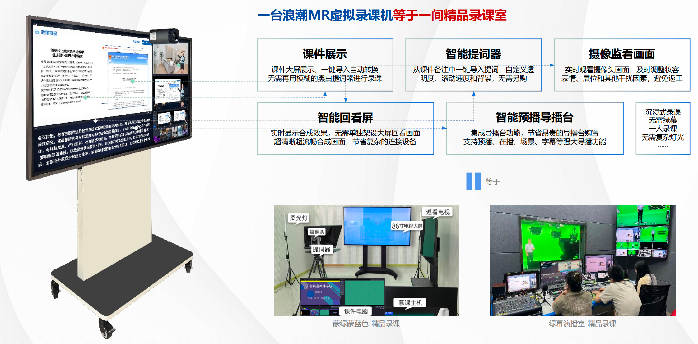 Ebpay(中国)MR虚拟录课一体机利用多种AI算法实现了在自然背景下智能抠像。该设备采用了多图层、视频层自由搭配、三维场景建模等先进技术,能够实现低延时、高帧率、高画质视频的合成、渲染和输出。其特点包括实时切换各种静态、动态3D场景,给予交互式、沉浸式服务体验。用户可以随时随地录制课程,自定义授课场景和贴图,无需场景搭建。