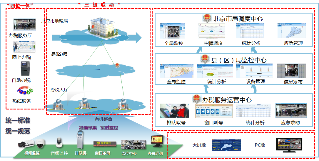 广东省办税服务厅实现了全省150个标准化办税服务厅所需音视频监控、排队叫号系统、评价系统设备等的建设和网上预约等多渠道预约业务办理。办税服务厅量化指标采用了现代化手段,科学规划遗留设备兼容方案,智能展现,实时刷新,顺利获得智能显示大屏动态展现四个办税服务渠道运行情况。全省统一的LED公告大屏信息发布,实现集中和分散管理相结合。